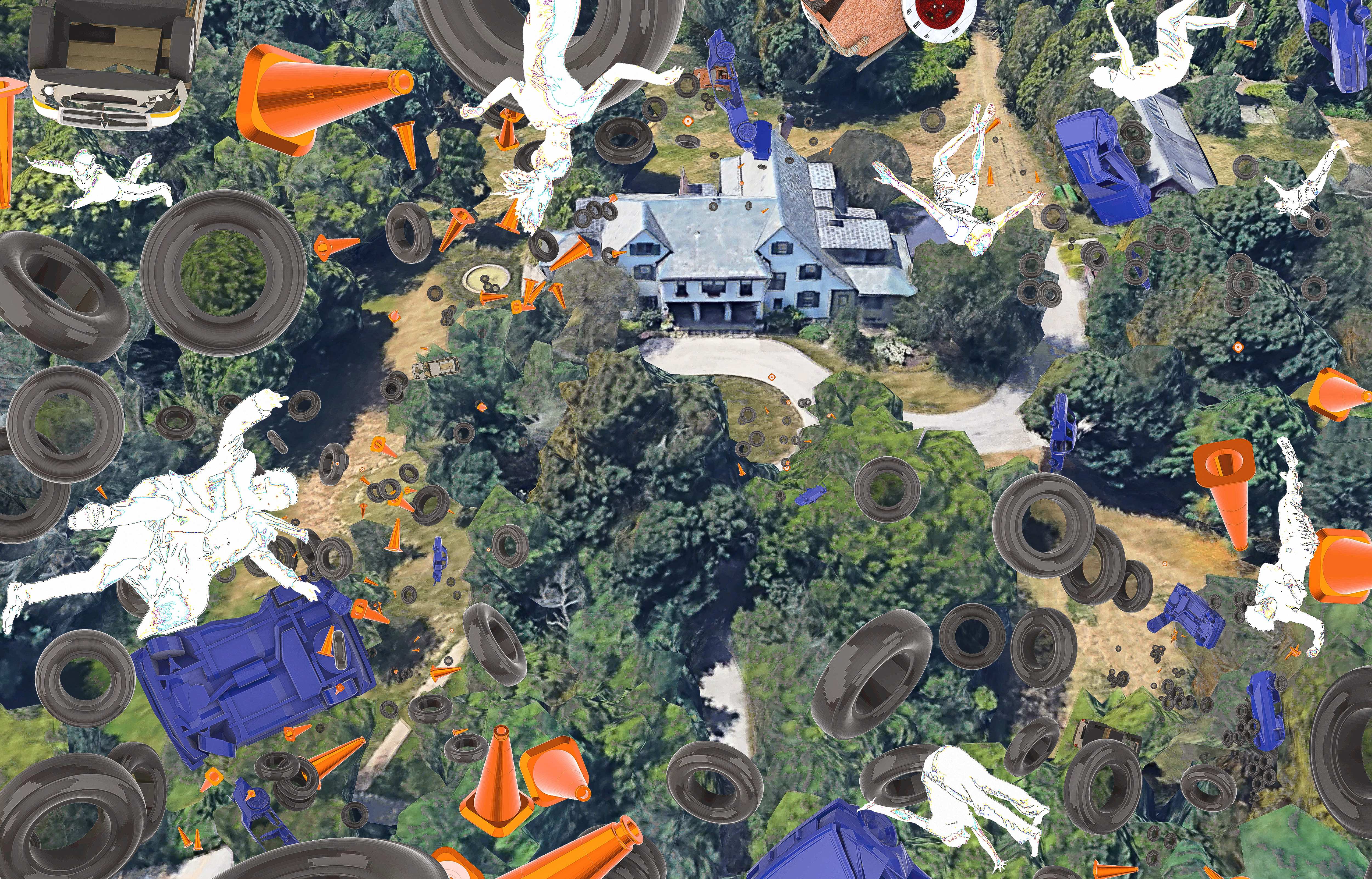 In order to assemble the temporary junkyard on the Ragdale campus, six scrap cars, 150+ tires, and 100+ traffic cones are trucked and towed to Lake Forest. Approximately ten rolls of 5’x150’ biodegradable jute fabric will blanket the automobile arrangements and be meticulously covered in germinated grass seeds. When first installed, the project will appear as a series of small landscape deformations in the lush Ragdale grounds; over time, the jute will transform into a bucolic carscape that grows softer and becomes more visible the more people interact with it.